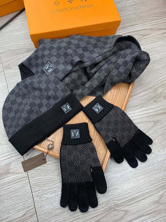 LV Grey Check Woolen Muffler, Gloves & Beanie Set